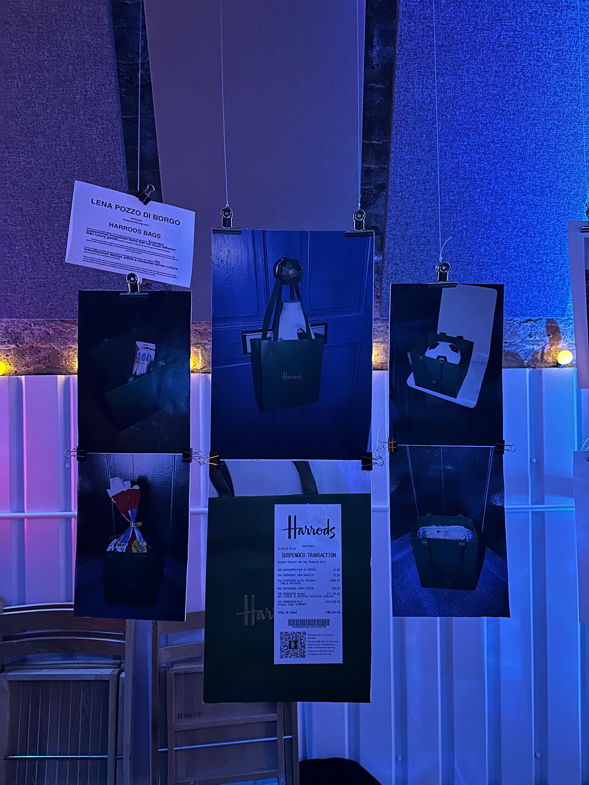 In the series « HARRODS BAGS », the cost of living in 2025 is put into perspective . Essential supermarket household items feel not much different than luxury goods bought in Harrods, the department store known for its opulent shopping.